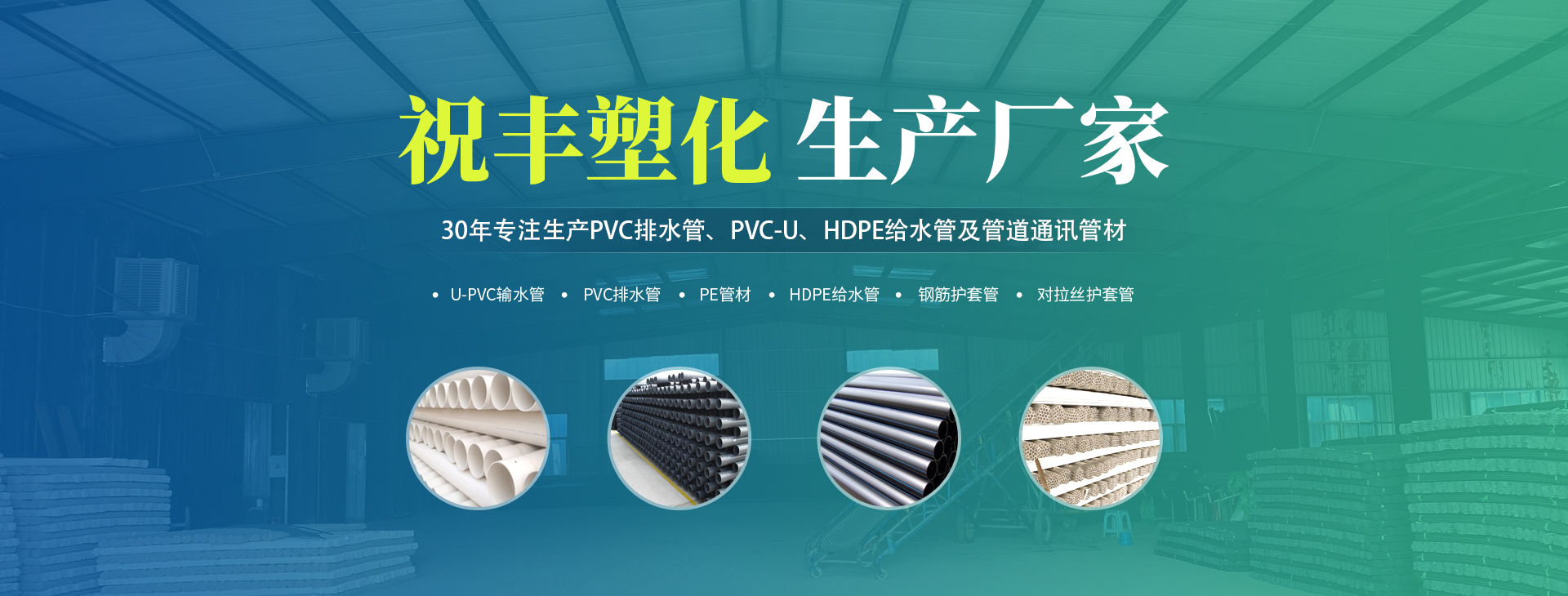 安陽(yáng)市祝豐塑化有限公司坐落在滑縣工業(yè)園區(qū),東臨大廣高速,西臨京珠高速,是鄭州、鶴壁、安陽(yáng)、濮陽(yáng)四個(gè)城市的輸紐,交通便利、環(huán)境優(yōu)美。       公司始建于八十年代,經(jīng)過(guò)二十余年的艱辛創(chuàng)業(yè),規(guī)模不斷壯大,由十多萬(wàn)元資產(chǎn)的小廠,發(fā)展到現(xiàn)占地面積達(dá)一萬(wàn)多平,建筑面積一萬(wàn)平,資產(chǎn)2000多萬(wàn)元管材生產(chǎn)企業(yè)。公司生產(chǎn)PVC-U、PVC排水管、HDPE給水管、鋼筋護(hù)套管管道通訊管材等產(chǎn)品,廣泛用于農(nóng)田節(jié)水、高山引水、人畜用水、建筑、電力通訊等多種用途,品種齊全。為了滿足用戶需求,可承攬各種給水、節(jié)水、灌溉工程?!白XS塑化”憑借強(qiáng)勁的實(shí)力,優(yōu)良的管理水平。“以質(zhì)量求生存,以信譽(yù)求發(fā)展”的原則全力以赴和大家共同塑造美好未來(lái)。..